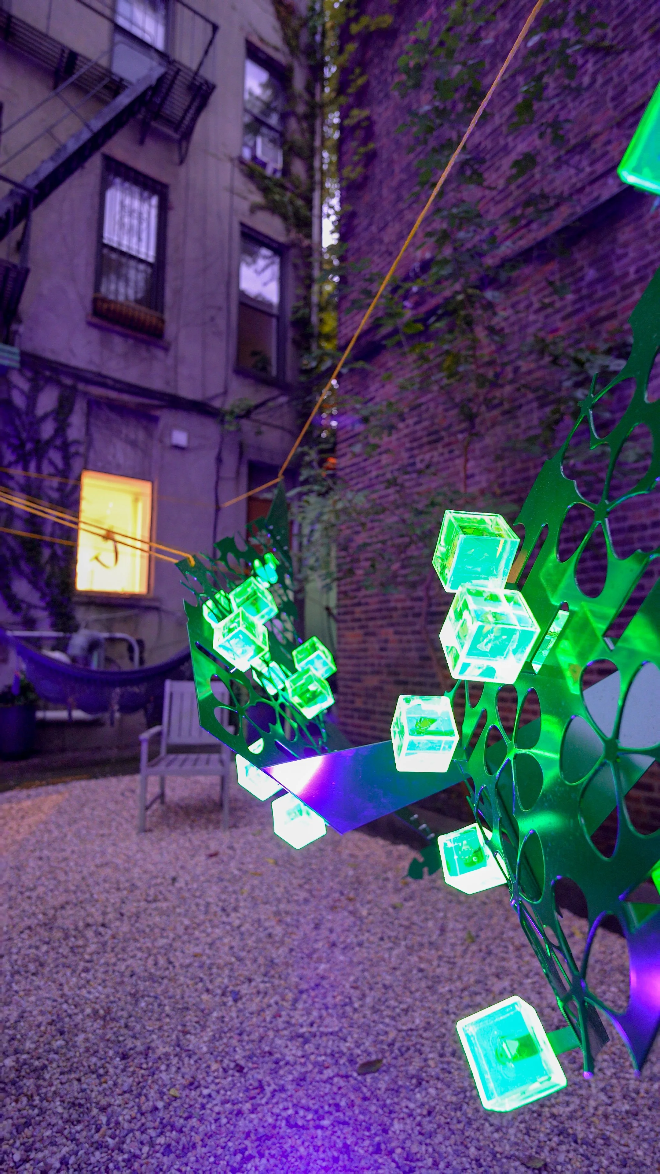 Articulated hanging elements repeat and contain the coquí within chromatic cubes that function as mnemonic devices. At times crystalline and precise, at others blurred and distorted, these forms reflect the instability of memory and the effects of distance.